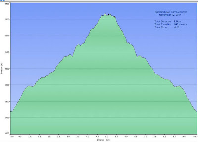 The first five kilometers are along roads and power line trails with continuous gradual elevation and no views at all. This portion went by quickly and easily.