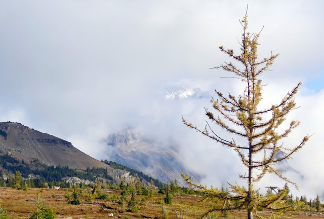 At times I am just a child at heart so how fitting to jump on the bandwagon with all the children who are riding the school bus for this first day back at school. This was my ride up that road that takes you to the "top of the world" at Sunshine Meadows.I caught the first bus and arrived at the Village surrounded by cloud and fog. It was a strange feeling. As the moments went on and I moved on up the trail towards Rock Isle Lake, the fog began to lift and this is what appeared.