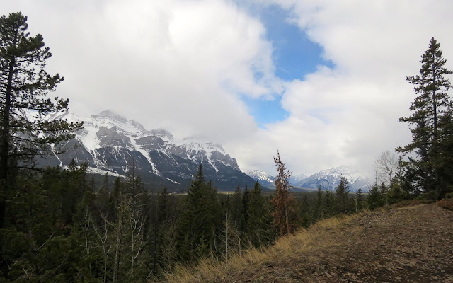 The snow and ice were now behind us, as were the dark clouds and flurries. The further along we went the cheerier it became. I was already beginning to wonder where the Legion in Canmore was and when we might arrive there. That was part of the becoming more cheerier. But first we got to enjoy meandering through meadows.I captured one more mountain scene before it was time to head on down to civilization. We found our way out to the backside of condo complexes, walked by construction, crossed over the highway on the bridge then marched right through downtown Canmore by shops and past tea spots.