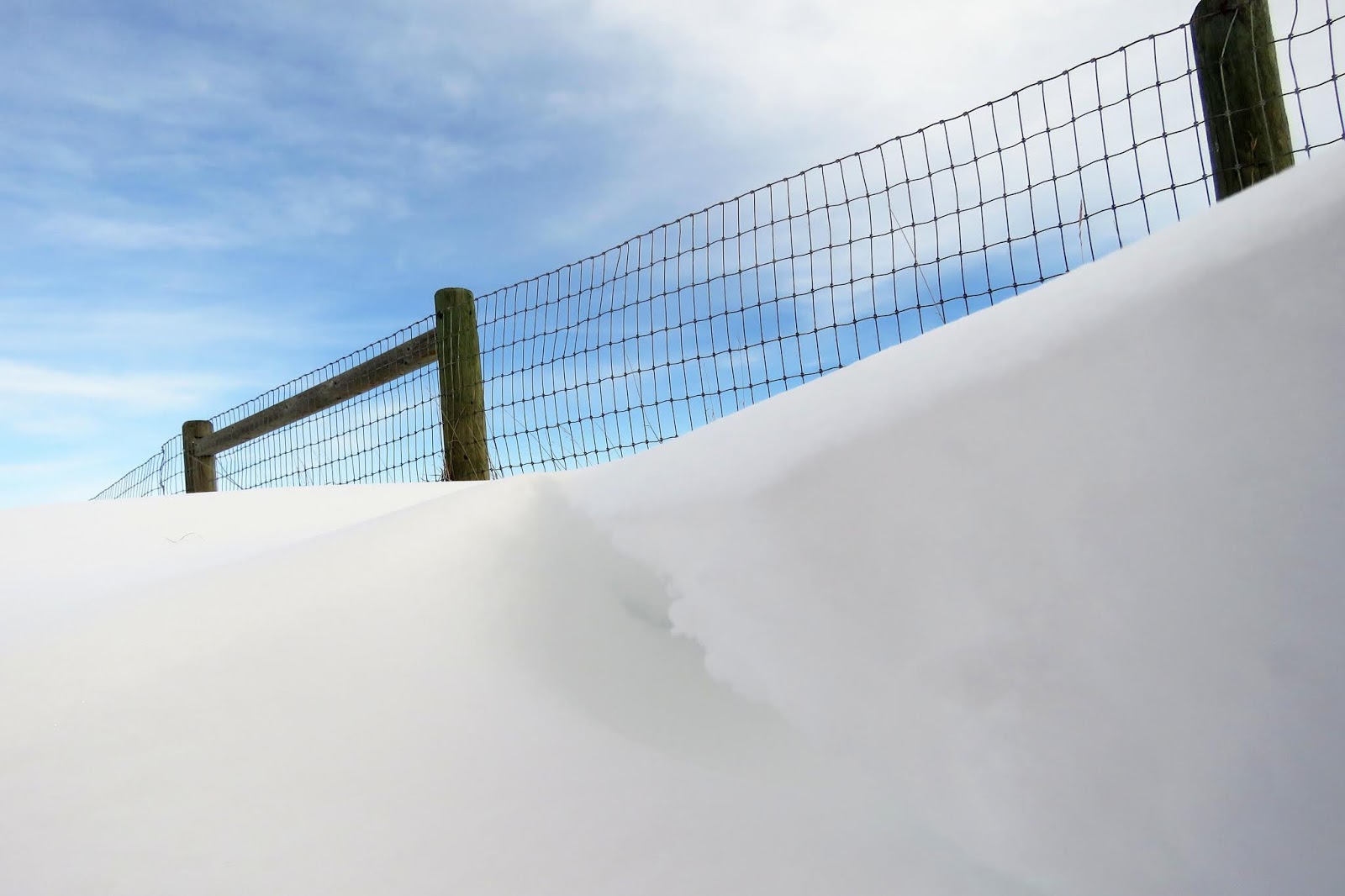 snow drifted high against the fence