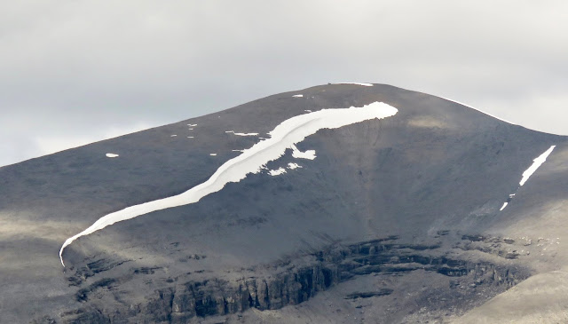 This is zoomed in on the Athabasca Glacier and you can see the tiny dots on the left on the snow, those are the buses going up and parking to let the tourists out to walk around a bit. The glacier is shrinking quickly.